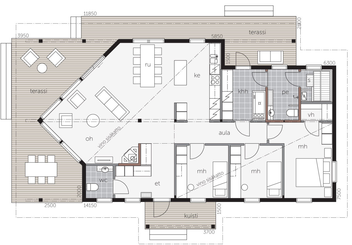 The stunning angular bay window and large lounge area give Kontio Saraniemi an original look, while also making the interior light and spacious.