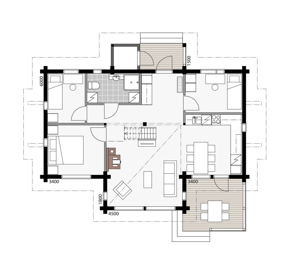 Les schémas de mise en page pratiques rendent la vie plus facile, mais aussi le confort et l'agrément ont été pris en compte. Les grandes baies vitrées apportent beaucoup de lumière, et le salon haut donne une sensation d'espace supplémentaire. Il y a des modèles avec ou sans sauna. Toutes les variantes du modèle ont trois chambres confortables, et le loft spacieux donne beaucoup d'espace supplémentaire pour les invités. La grande terrasse vous permet de profiter de l'air extérieur pendant les chaudes journées d'été. Il y a un espace de stockage pour l'équipement de loisirs à côté de la porte d'entrée.