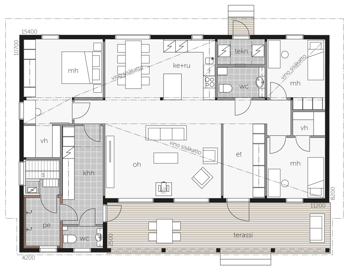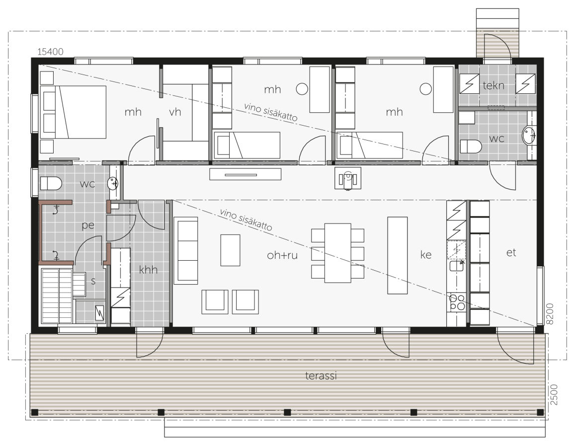 Valmiiksi työstetty 205 x 275 mm lamellihirsi, eriste alimman hirren ja perustuksen väliin, tiivisteet hirsien väliin valmiiksi asennettuina, vaarnatapit hirsien kiinnittämiseen, ovien ja ikkunoiden kiinnittämiseen tarvittavat karapuut, kipsilevyt väliseinissä, asennusvalmiit naulalevyristikot/-kehät/vaarnapalkit kiinnittimineen, liimapuut, tiilikatteen ruoteet ja aluskate tai huopakaton aluslaudoitus, räystään otsalaudat, tarvittavat räystään ja terassin aluslaudat, päätyräystäiden runkorakenteet, eristetyt valkoiset ulko-ovet, 3-lasiset valkoiset argontäytteiset selektiivi-ikkunat heloineen ja tiivisteineen, tuuletusikkunoissa hyttyspuitteet, ovi- ja ikkunavuorilaudat, kuistien kaiteet, kuistien pilarit ja palkit, tarvittavat pilareiden säätöjalat, päätyjen rungot, päätyjen ulkopuolinen verhous, kaulusten ulkopuolinen verhous, väliseinärungot, kipsilevyt väliseiniin, sisäkaton harvarimoitus, höyrynsulku kattoon, sisäkattopaneelit, väliovet, kokolasinen saunan ovi, muotoon höylätyt jalkalistat, muotoon höylätyt kattolistat, asennusvalmiit kuusilauteet, alumiinipaperi saunan sisäkattoon, saunan ja pesuhuoneen sisäkaton alaslaskun koolaus ja paneelit.