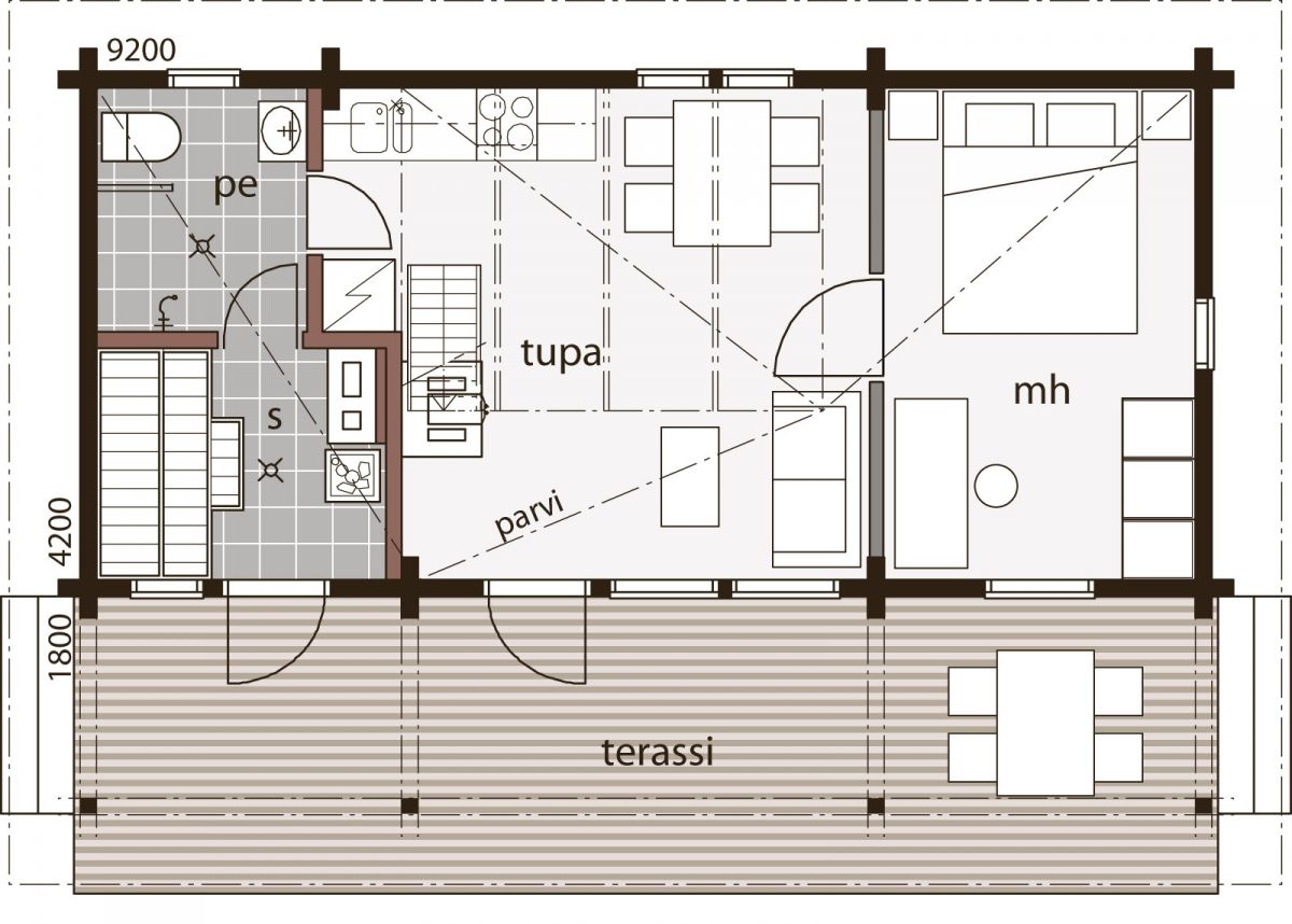 Valmiiksi työstetty 95 x 170 mm höylähirsi, eriste alimman hirren ja perustuksen väliin, tiivisteet hirsien väliin, vaarnat hirsien kiinnittämiseen, ovien ja ikkunoiden kiinnittämiseen tarvittavat karapuut, asennusvalmiit naulalevyristikot/-kehät/kattopalkit, huopakatteen aluslaudoitus, räystään otsalaudat, päätyräystäiden runkorakenteet, lattiakoolaukset, lattialaudat, höyrynsulku lattiaan, painekyllästetty koolaus ja lattialauta kuistille ja terassille, eristetyt ulko-ovet, alumiiniulkopuitteiset 2-lasiset ikkunat heloineen ja tiivisteineen, tuuletusikkunoihin sääskiverkot, ovi- ja ikkunavuorilaudat, vuorilautojen koristeet sisä- ja ulkopuolelle, kuistien kaiteet, kuistien pilarit ja palkit, tarvittavat pilarien säätöjalat, päätyjen rungot, päätyjen ulkopuolinen verhous, kaulusten ulkopuolinen verhous, väliseinärunkotolpat, väliseinän ala- ja yläjuoksut, hirsipaneelit väliseiniin, höyrysulku kattoon, sisäkattopaneelit, väliovet lakattuja puupeiliovia, lasiaukollinen saunan ovi, muotoon höylätyt jalkalistat, muotoon höylätyt kattolistat, saunan lauteet kuusilautaa, alumiinipaperi saunan sisäkattoon, saunan paneelit.