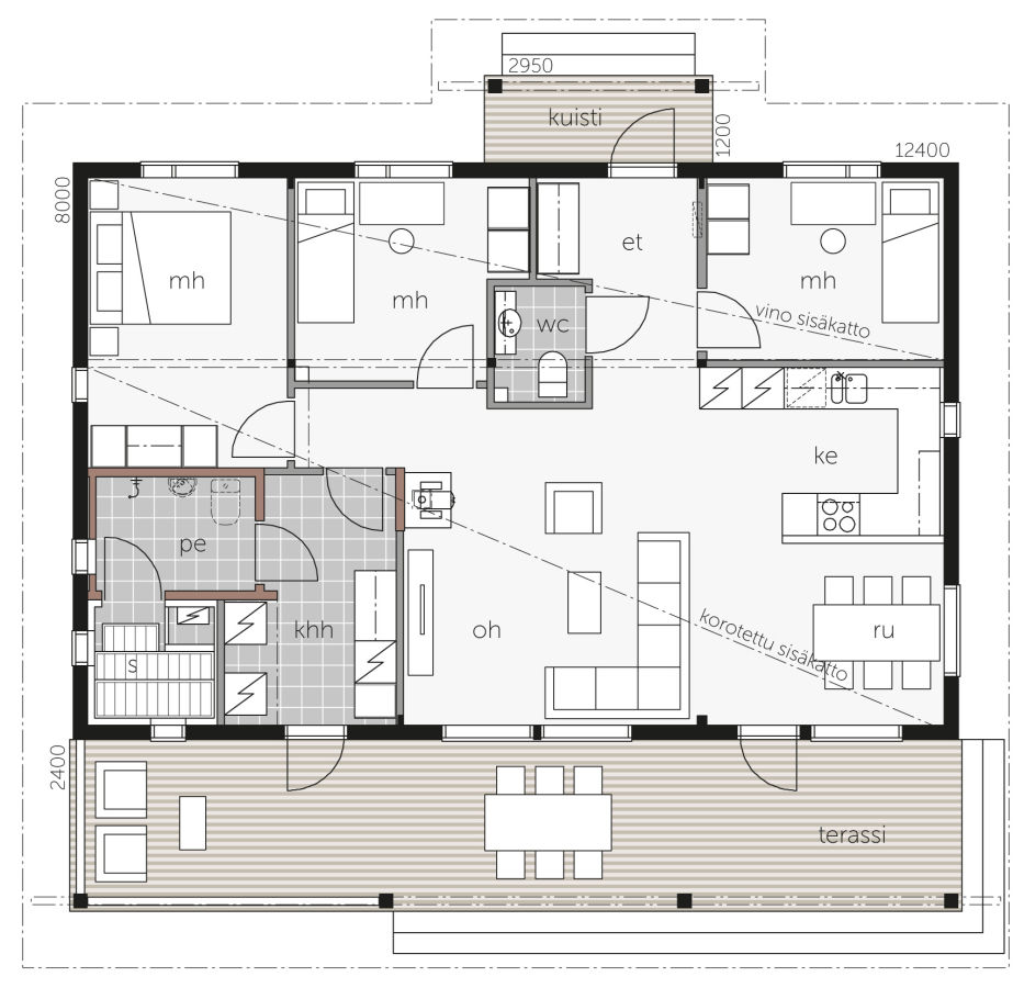 Avara oleskelutila keittiön läheisyydessä kokoaa asukkaat ja vieraat yhteen takkatulen ääreen. Olohuoneesta ja pesutiloista pääsee rakennuksen mittaiselle katetulle terassille. Korkea sisäkatto lisää avaruutta ja valoisuutta. Rakennus sopii niin taajamaan kuin haja-asutusseudullekin.