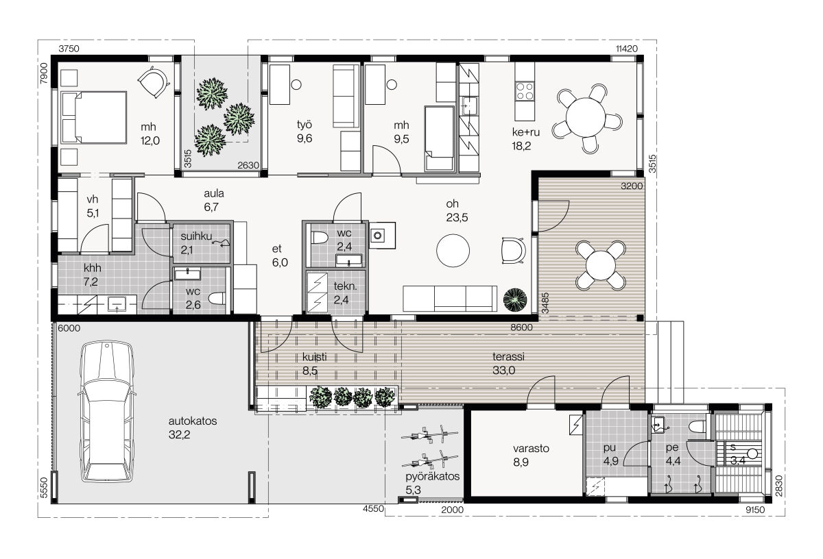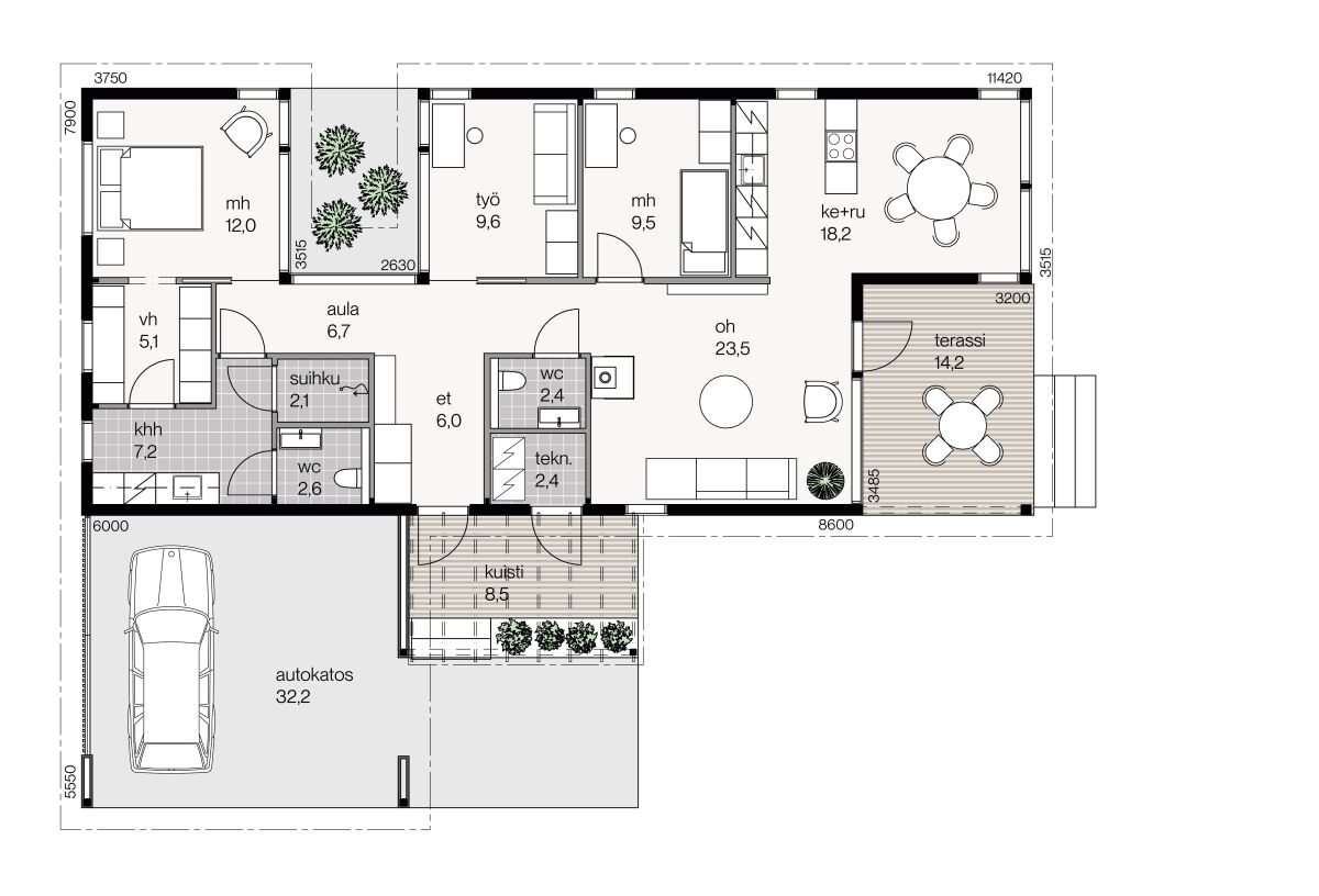 Vehmas 123 A, A autokatoksella ja A pihasaunalla ja autokatoksella -mallit, 1 kerros omakotitalo