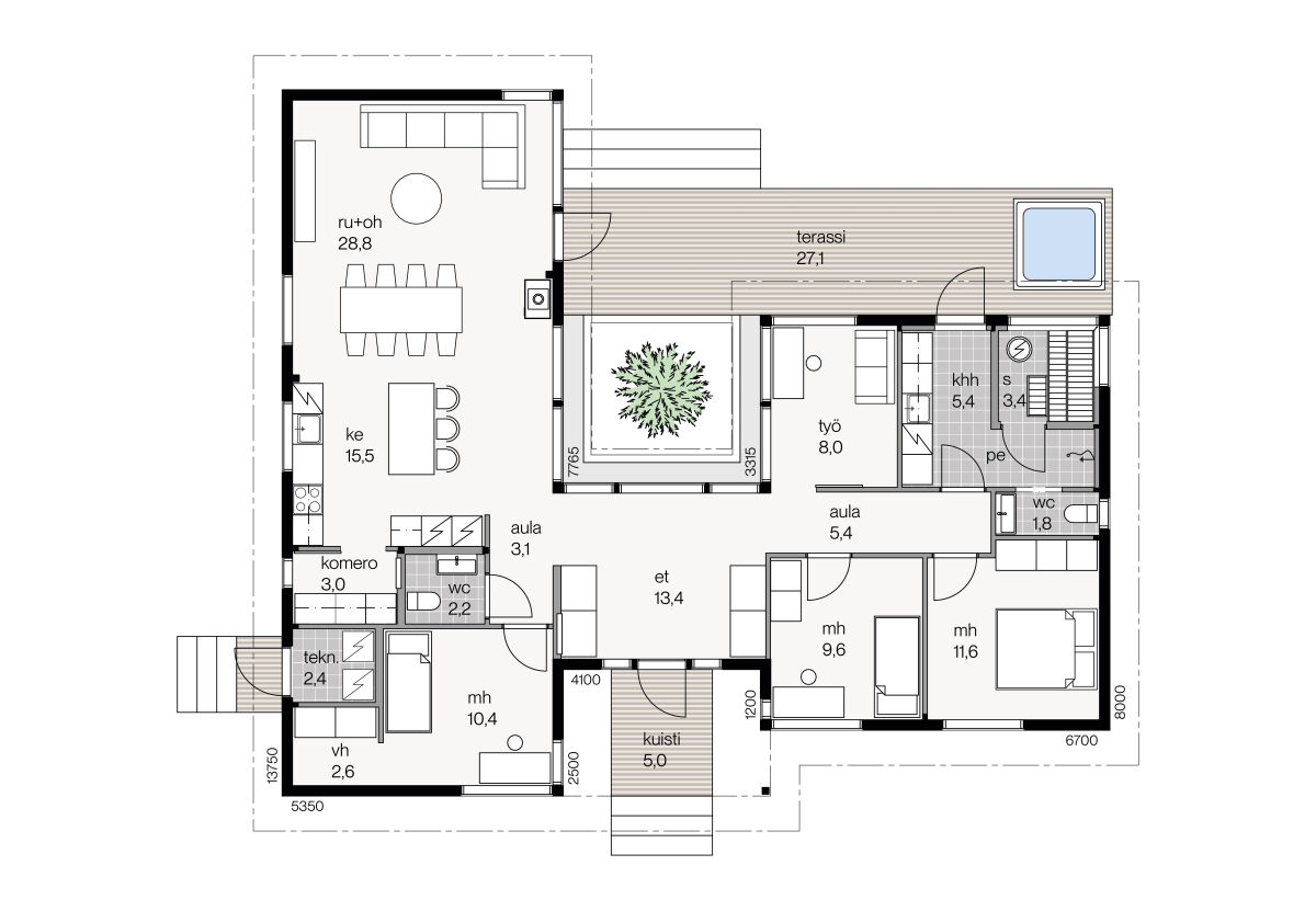Vihersyvennyksen ympärille kietoutuva talo tarjoaa reilusti tilaa. Sisään astuttaessa juhlavasta sisäänkäynnistä avautuu upea näkymä vihersyvennykseen ja sen ympärille levittäytyviin tiloihin, luoden elämyksellisen kokemuksen. Oleskelusiivessä on tilaa yhdessäoloon. Oleskelutiloista voi ikkunoita muuttamalla avata näkymiä ympäristöön maisemat parhaalla tavalla hyödyntäen. Neljä makuuhuonetta muuntautuu monenlaiseen käyttötarkoitukseen elämäntilanteiden mukana.