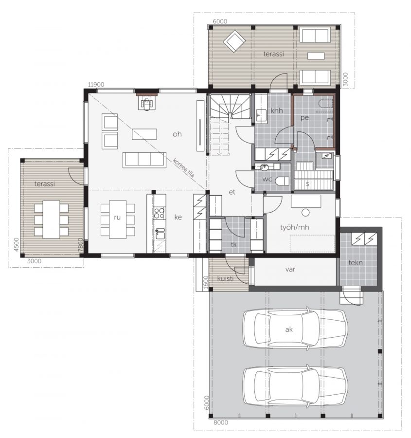 Alakerrassa tilat jakautuvat isoon ja avaraan olohuoneeseen, keittiöön, ruokailutilaan, kylpyosastoon ja yhdistetyksi työ- ja vierashuoneeksi. Olohuone jakautuu sohvaryhmän ja nojatuolien avulla sekä takkahuoneeksi että tv-tilaksi.