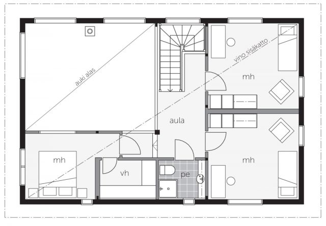 Yläkertaan sijoittuu kolme makuuhuonetta ja kylpyhuone. Perheen luona vierailee paljon sukulaisia, vierashuoneita on tarvittaessa käytössä kaksi. Ruokailemaan päästään niin sisälle kuin ulos isommallakin porukalla.