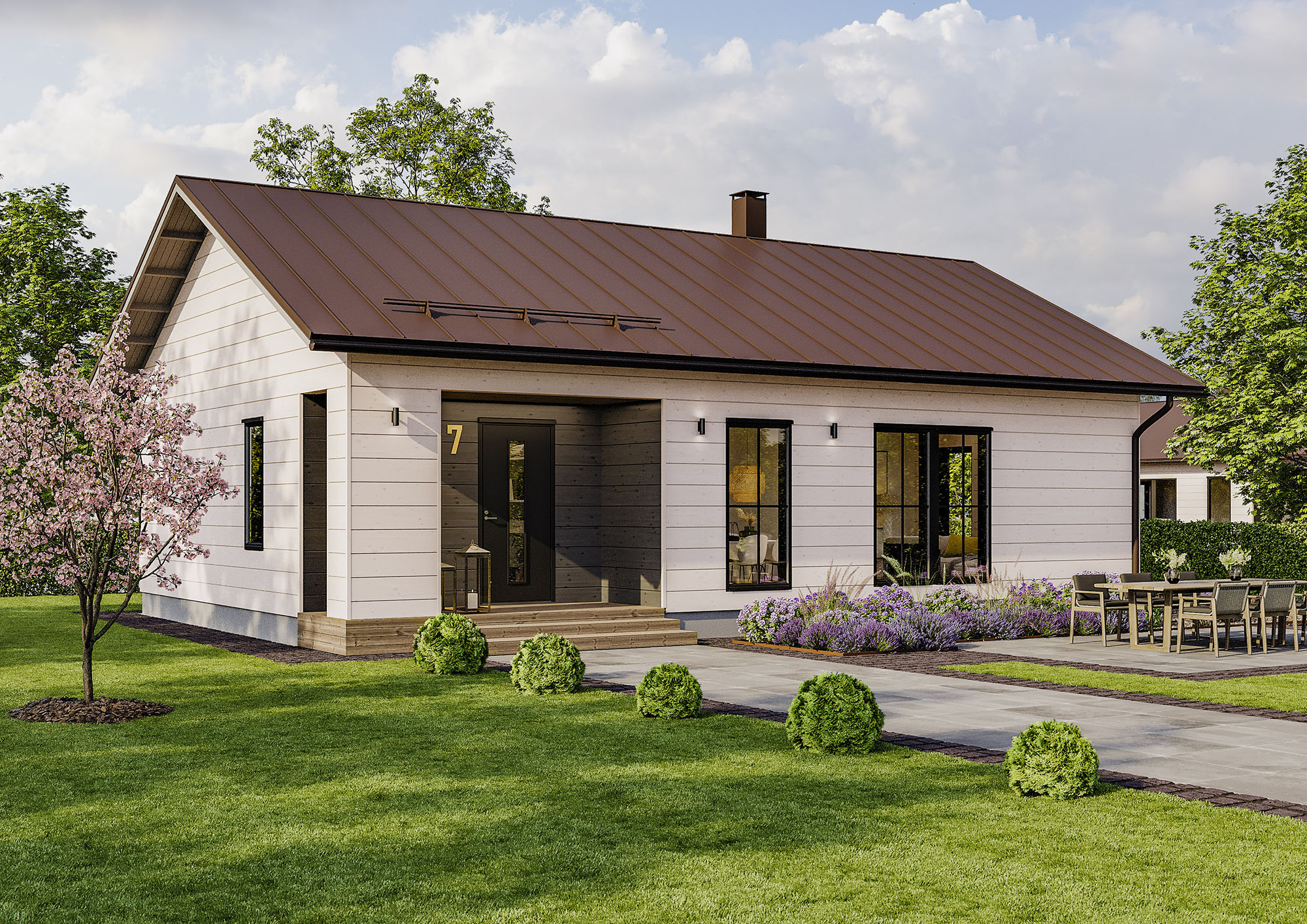 -Kahden aikuisen ensimmäisessä yhteisessä kodissa on tilaa juuri sopivasti kahdelle aikuiselle ja 15-vuotiaalle tytölle sekä satunnaisesti vieraileville aikuisille lapsille. Alakerran pohja on toimiva ja käytännöllinen. Avokeittiössä on tilaa ruuanlaittoon ja mahdollisuus seurustelulle. Yläkerta on tornimainen, koko talon syvyinen kerros, jossa on vain iso makuuhuone ja kylpyhuone. Isot ikkunat ottavat maiseman osaksi sisustusta. Terasseja on paljon ja hoidettavaa pihaa vähän, tällä haimme asukkaille helppohoitoisuutta ja mahdollisuutta mukavaan oleskeluun. Kontion creative manager, Olavi Kujanen kertoo.