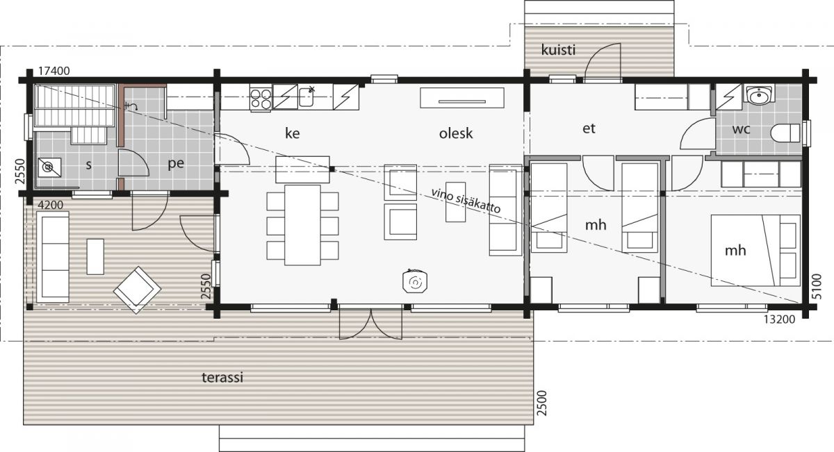 Kontio Sinitaivas — комфортабельный коттедж для долгосрочного пребывания. Дизайн этой модели максимально используются жилые и спальные помещения, а большие окна открывают вид на прилегающую территорию.