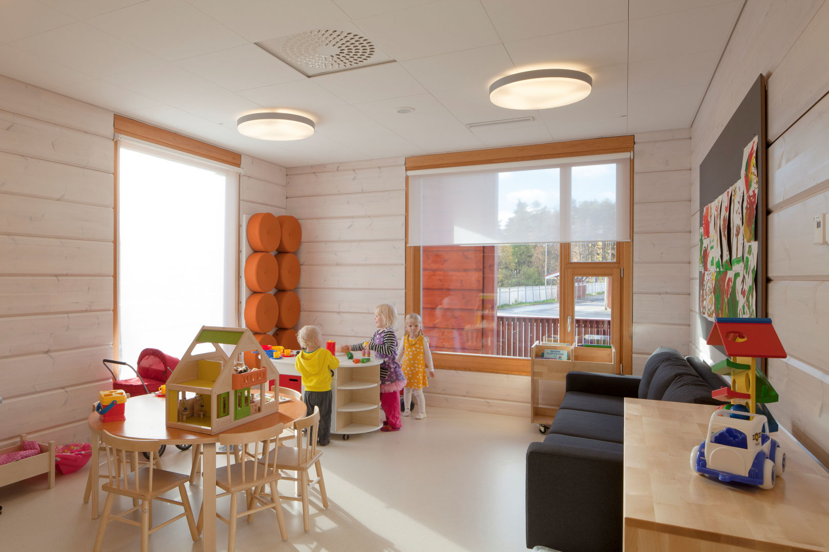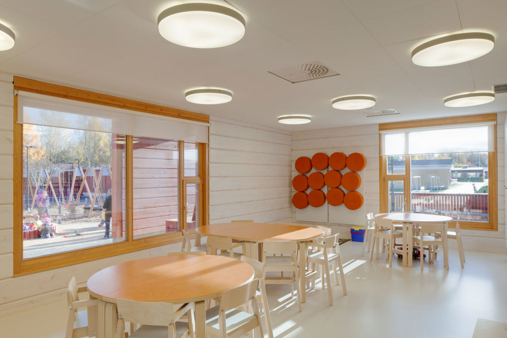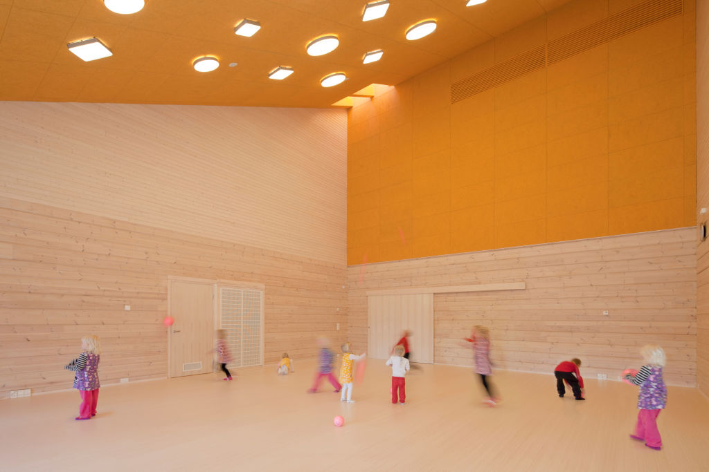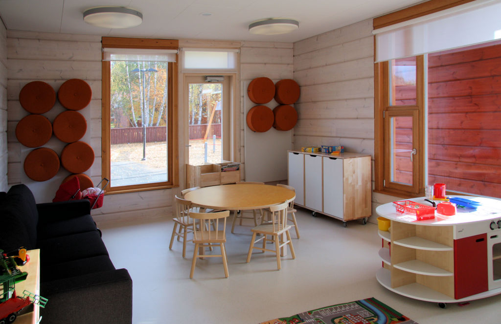 Помещение площадью 1300 кв.м. разделено на шесть частей и является местом, где ежедневно проводит свое время в общей сложности примерно 100 малышей.По словам заведующей детским садом, отзывы до сих пор были очень положительными: «Каждый посетитель без исключения отмечает, насколько эффективно бревенчатые стены поглощают шум. У нас здесь большие группы детей и, тем не менее, в комнатах тихо и спокойно».