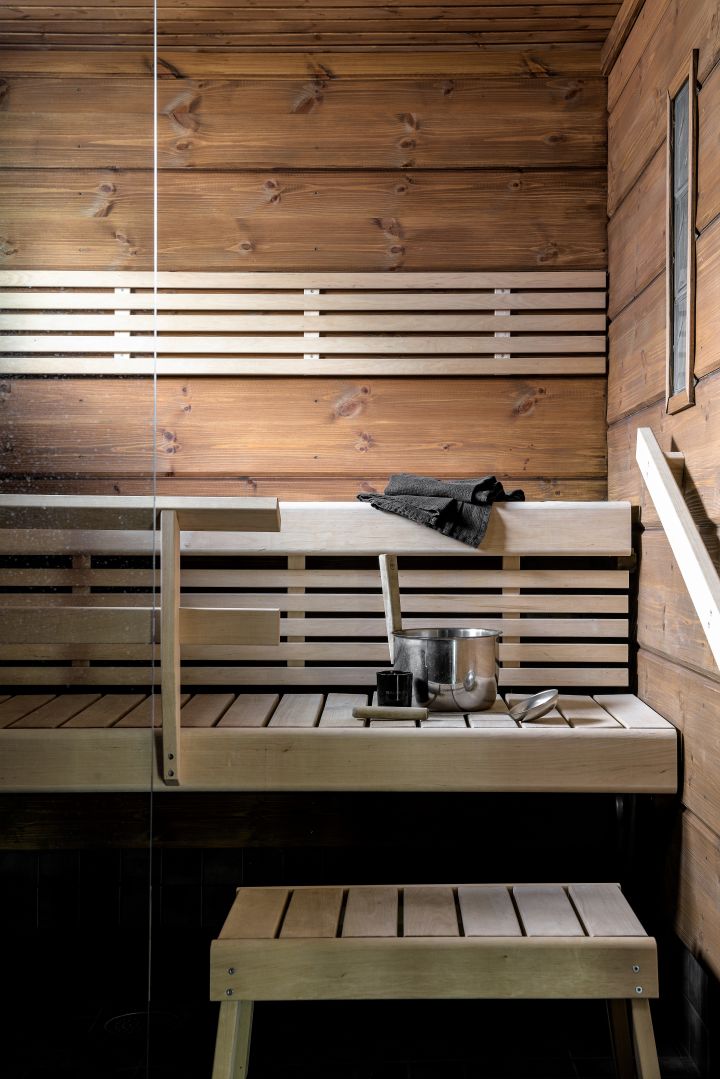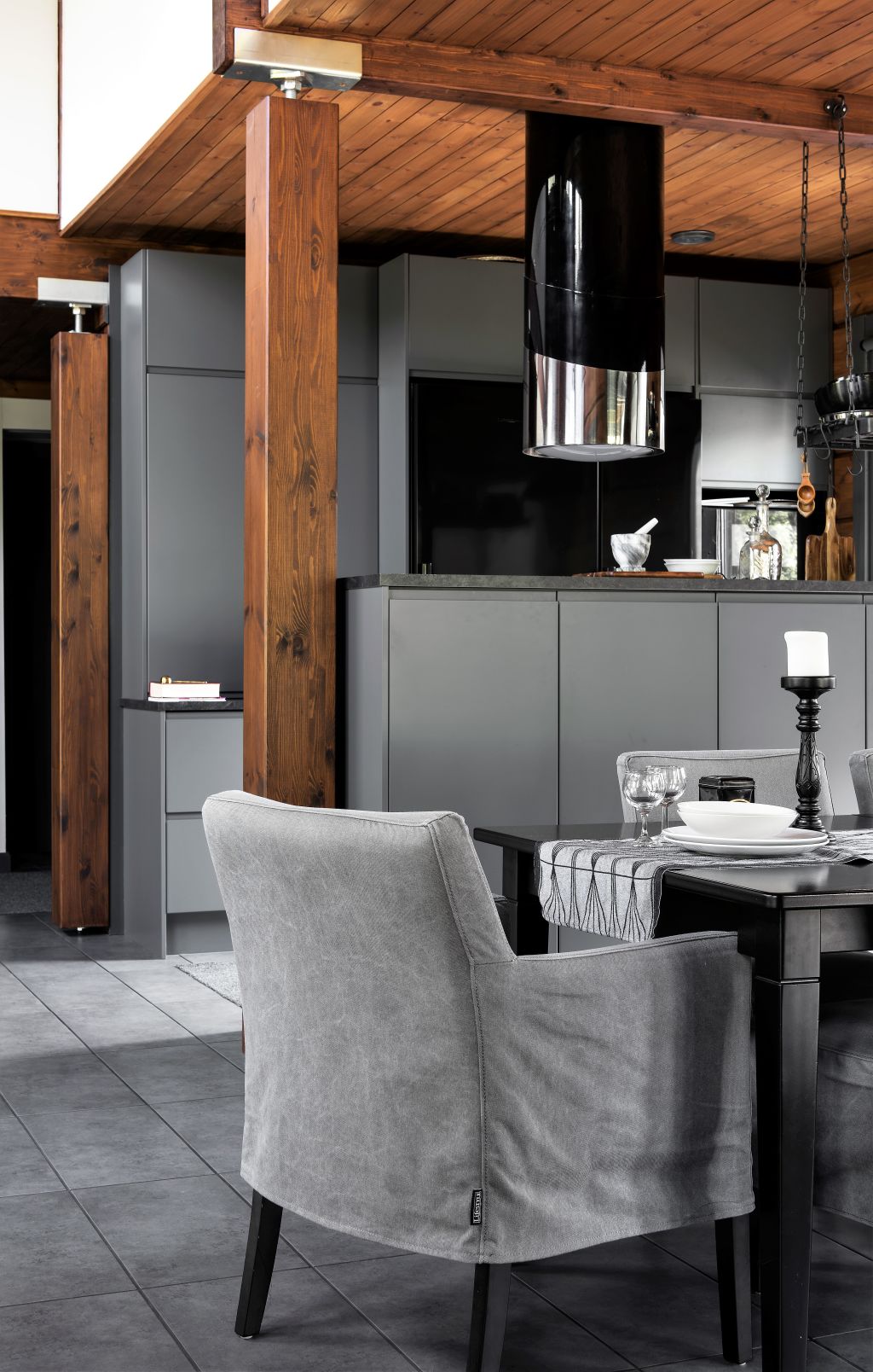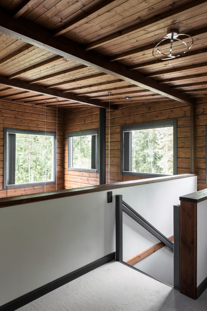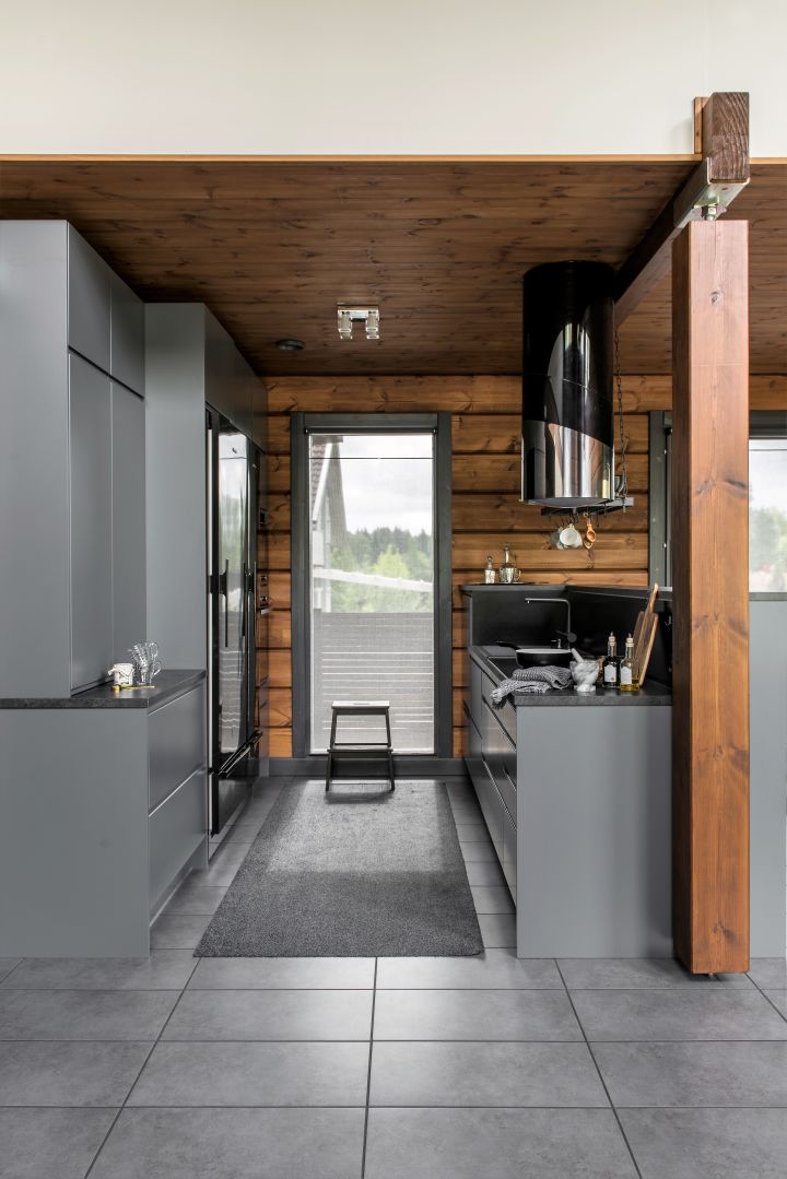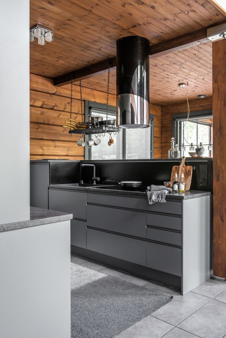 The log home is located just outside Helsinki, and it has high ceilings and a luxury interior. The impressive dark brown wooden walls were inspired by the interiors of the Kontio Mountain Ski House in Åre. The brown wood combined with dark grey windows, cabinets and modern designer lamps add to the luxury feeling. They also have their own spa and swimming pool outside on the covered terrace, which are enjoyed frequently by the family and their friends.