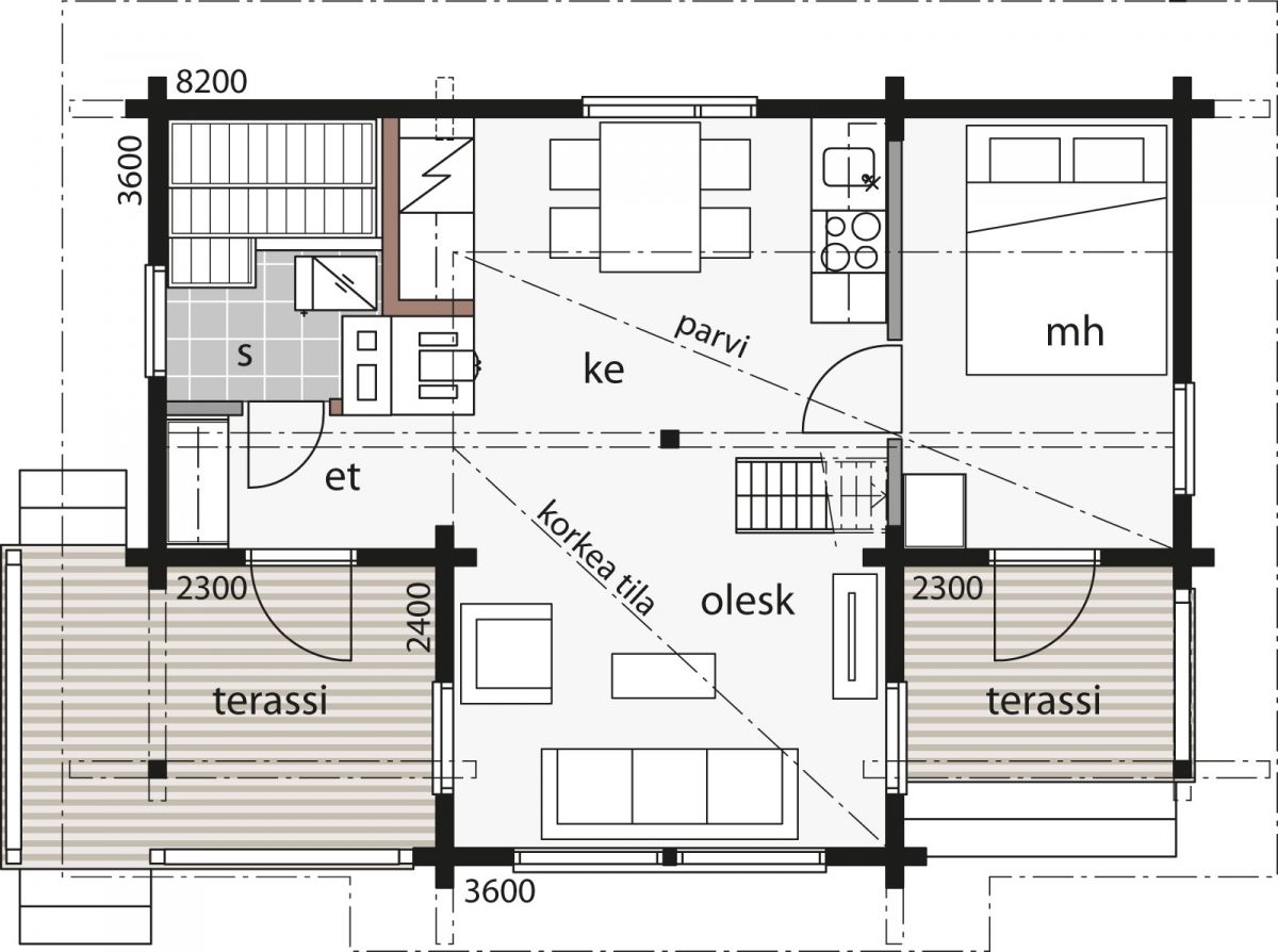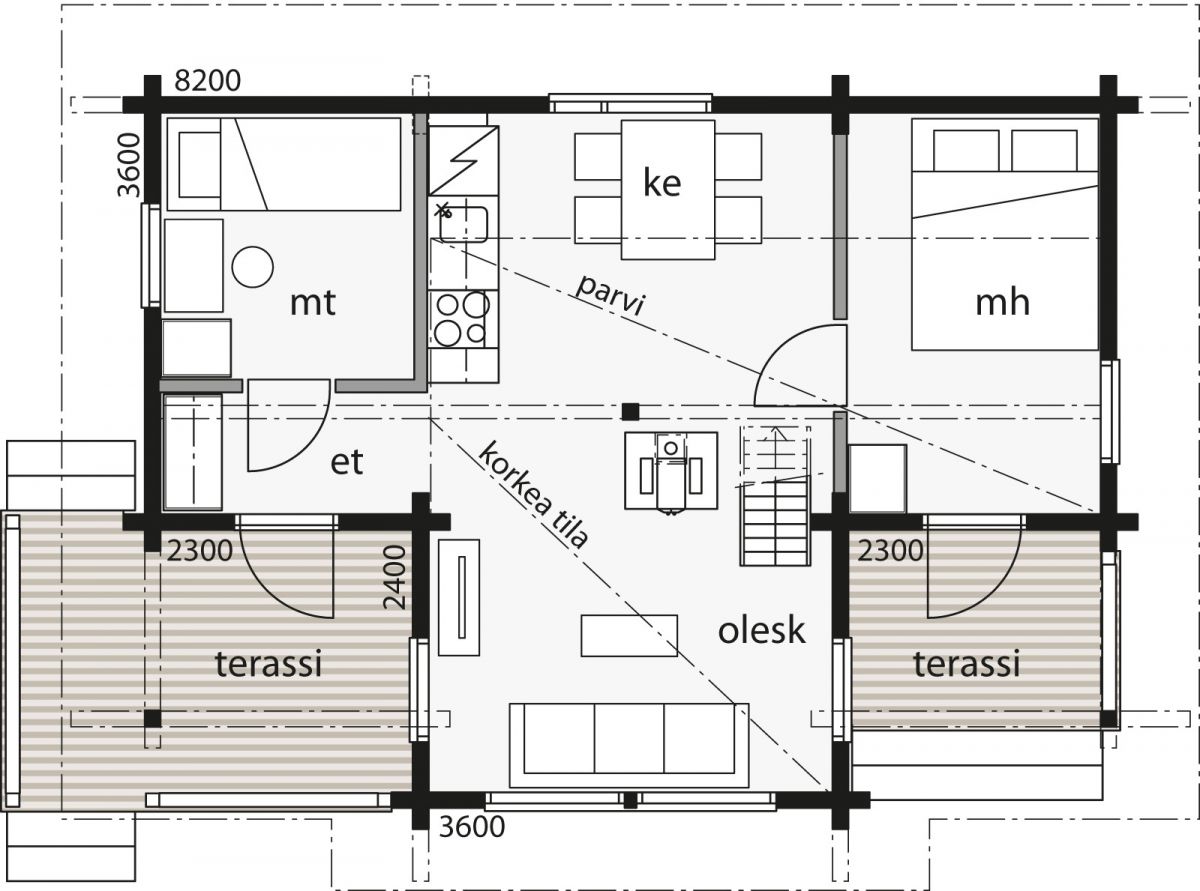 Kontio Saltkråkans planlösning är praktisk och gjord med bekvämt boende som målsättning. Loungen har högt till tak och de stora fönstren ger ljus och en känsla av rymd, även på loftet.